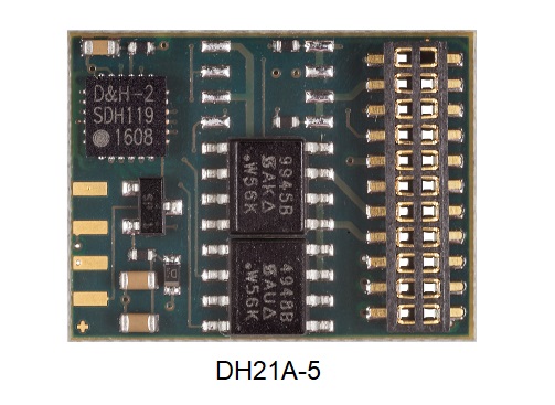 - DH21A-5 Für die 21-polige Schnittstelle mit unverstärkte (Logikpegel 5 Volt) Funktionsausgänge AUX3 und AUX4. (NEM 660/RCN-121)