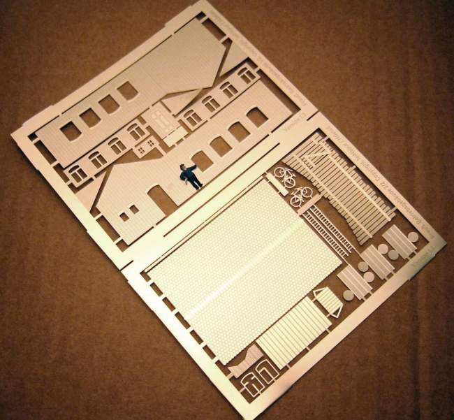 Der Zusammenbau ist genauso einfach wie der Zusammenbau eines Plastikbausatzes, wenn nicht sogar einfacher. Das Modell besteht aus zwei Ätzrahmen, einer mit Dach, der andere mit den Seitenwänden. Zuerst entfernt man Dach und Wände aus dem Rahmen. Das geht mit einer guten Schere oder einem Seitenschneider. Eventuell muss man die Grate noch etwas verfeilen. Dann biegt man biegt die Wände im Winkel von 90 Grad.