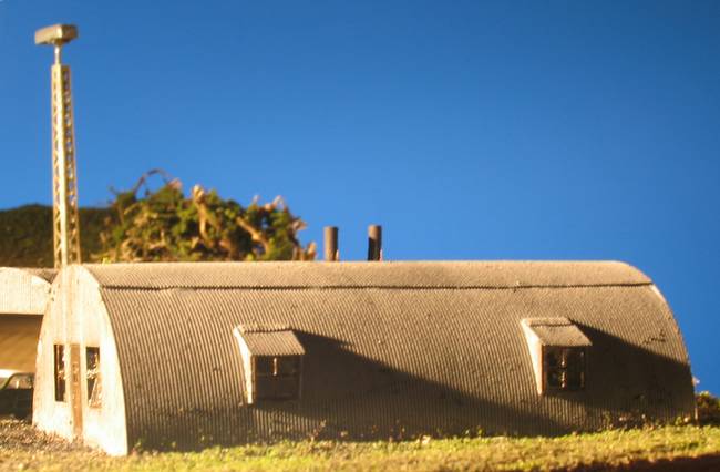 Nissenhütte als Notunterkunft im umfangreichem Zubehör wie Fahrräder und Gartenwerkzeug. Detaillierter Bausatz im Maßstab 1 zu 160. Neusilber Platine.
