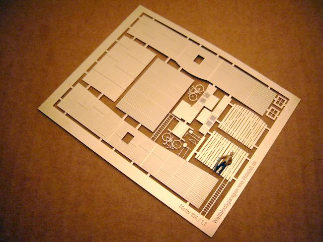 Die kleinen Details werden einfach vom Ätzrahmen entfernt und nach Belieben lackiert. Der Lenker des Fahrrads muss um 90 Grad gebogen werden, die Pedale ebenfalls. Die Kaninchenställe werden zu einem Viereck gebogen und aufeinander gestellt. Der Stall besteht aus dem Sockel, dem "Zwischenstock" und dem oberen Stall mit schrägem Dach. Die Knickkanten sind aussen.