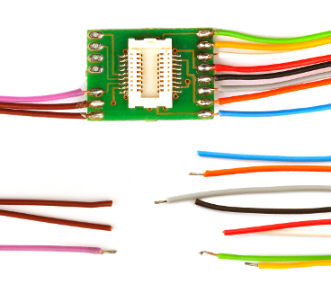 Mit Hilfe unserers Anschlussadapters N18-G können Sie Decoder mit einer Next18 Schnittstelle in Ihrem Modell frei verdrahten. Sie profitieren dadurch von einer sicheren, steckbaren Verbindung, welche den problemlosen Austausch des Decoders jederzeit zulässt. Alle Anschlussdrähte befinden sich auf dem Adapter – es führen keine weiteren Drähte vom Decoder zum Modell.
