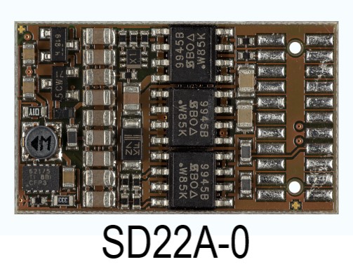 Der Fahrzeugsounddecoder SD22A unterstützt das Bremsen mit asymmetrischer Digitalspannung (vier Dioden in Serie und eine Diode antiparallel), die Langsamfahrt (mit geeigneten Bremsmodulen) und die bidirektionale Kommunikation (Lokadressrückmeldung im DCC-Betrieb, RailCom®).