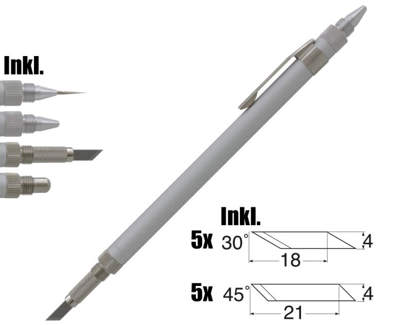 Das Messer besteht komplett aus robustem Aluminium und ist somit besonders langlebig und stabil. Es verfügt über 2 verschiedene Spitzen, die zum Durchrubbeln von Selbstklebebuchstaben verwendet werden können. Zusätzlich ist eine Klingenhalterung und eine Edelstahl-Punktierspitze integriert, die bei Nichtgebrauch im Griff verschwindet.