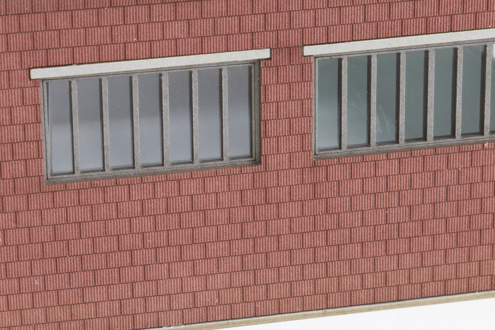 Werkstatt mit kleinem Büroraum, vorgesetzte Front in schlichter Beton/Steinoptik. Die restlichen Wände in unverputzter Ziegeloptik mit großen Steinen, aufwendig in mehreren Tiefen graviert, mit großen Fenstern und einem Giebel-Dachfenster.