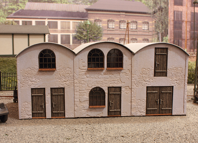 Das Vorbild zu dieser kleinen Werkstatt stand bis in die 2000er Jahre auf dem Gelände der Tuchfabrik "Schürmann und Schröder". Die Hallen können auch einzeln gestellt oder als Halbrelief gebaut werden. Sehr aufwendig gravierte, verhauene Putzfassade.