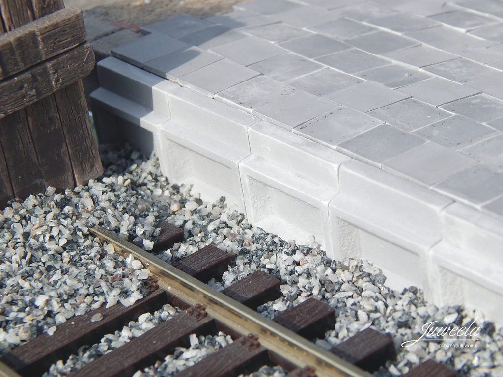 Zur Gestaltung oder zum Anlegen von Bahnsteigen für die Modelleisenbahn Spur 0. Die Bahnsteigkanten werden als Verblender eingesetzt. So läßt sich schnell und einfach ein optisch reizvoller Bahnsteig-Bereich und Hingucker im Diorama darstellen.