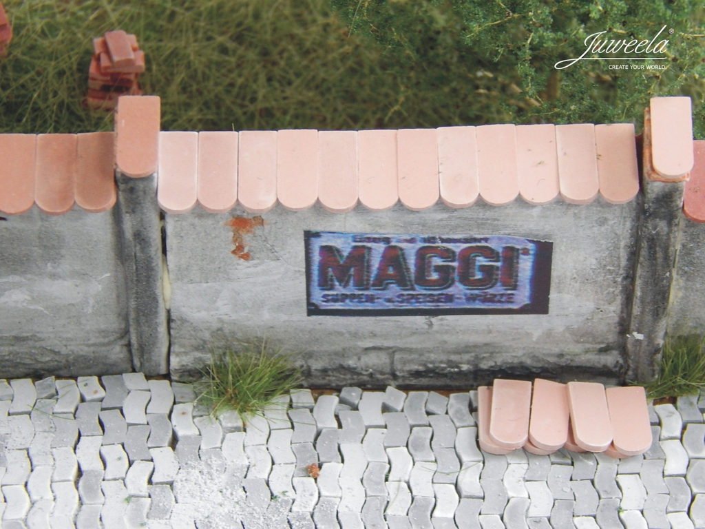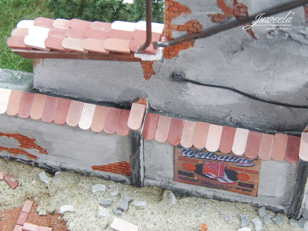 Modellbau mit individueller Gestaltungsmöglichkeit: Darstellung eines eindeckten oder zerstörten Daches; ebenso ist loses Streuen oder Stapeln möglich.