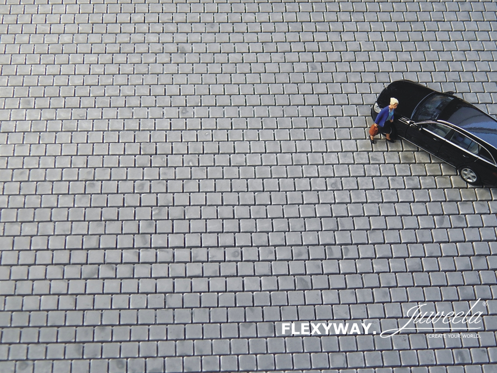 Flexyway sind feste Juweela Steine, die einzeln auf einer dünnen Trägerfolie sitzen. Das macht das komplette Segment in-sich-selbst-flexibel. Jeder Stein kann einzeln entnommen werden: Schlaglöcher, Schäden, Krater oder die Baustelle können also da sein wo gewünscht.