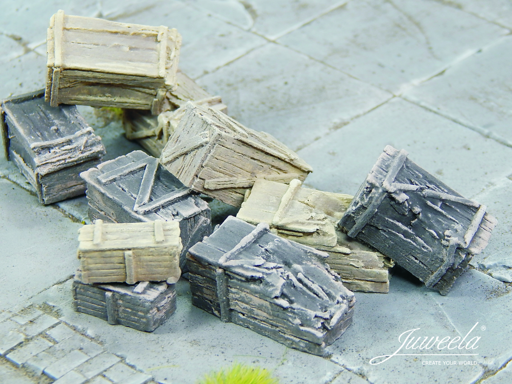 Alte Holzkisten gehören einfach zum üblichen urbanen Bild - im Vorbild ebenso wie im Modell Diorama. Diese hier sind alt, abgenutzt, beschädigt, gesplittert.