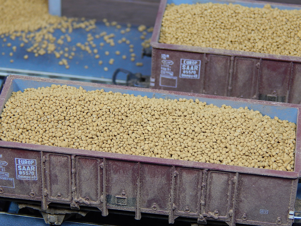 In einen offenen Güterwagen (in unserem Bsp. ein Hochbordwagen von Piko) passen realistisch gehäuft ca. 25 g Kartoffeln