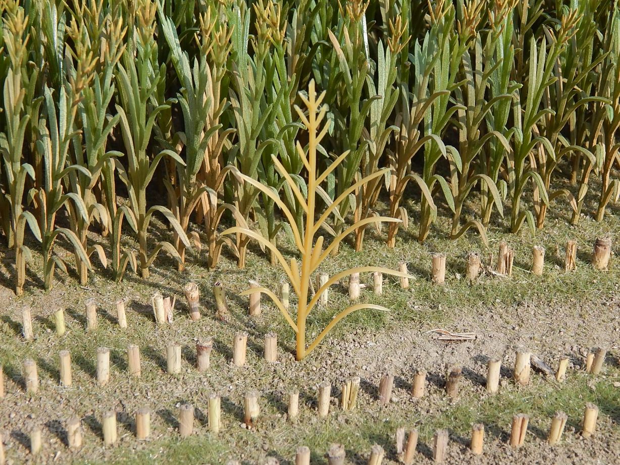 Die Kolben sind dem Vorbild entsprechend geschlossen. Die Fahne sollte nachkoloriert werden. Hierzu wird die Pflanze einfach kopfüber in Farbe beige eingetaucht oder die Fahnen der bereits eingepflanzten Pflanzen mit der Airbrush angesprüht.