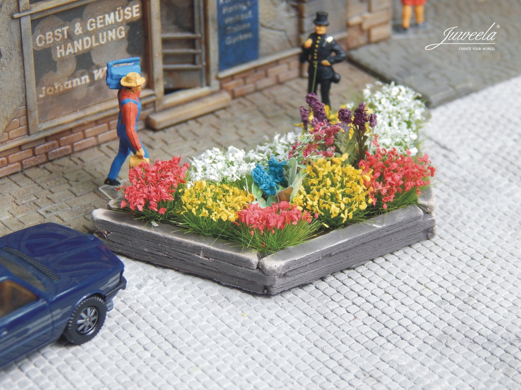 Und das machen Sie auch auf dem Miniatur Diorama. Einfach "bepflanzen" - je nach "Pflegezustand" mit Blumen oder einfach nur mit Gestrüpp: Immer ein Hingucker auf der Modellanlage.