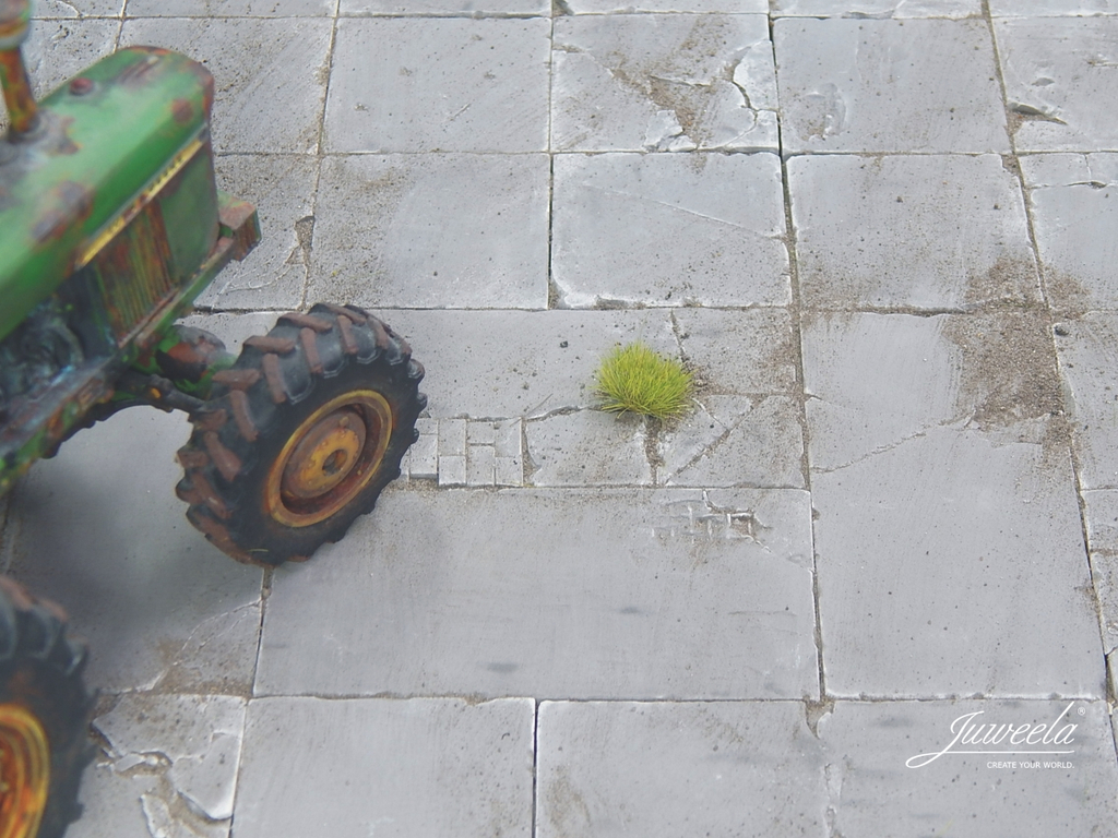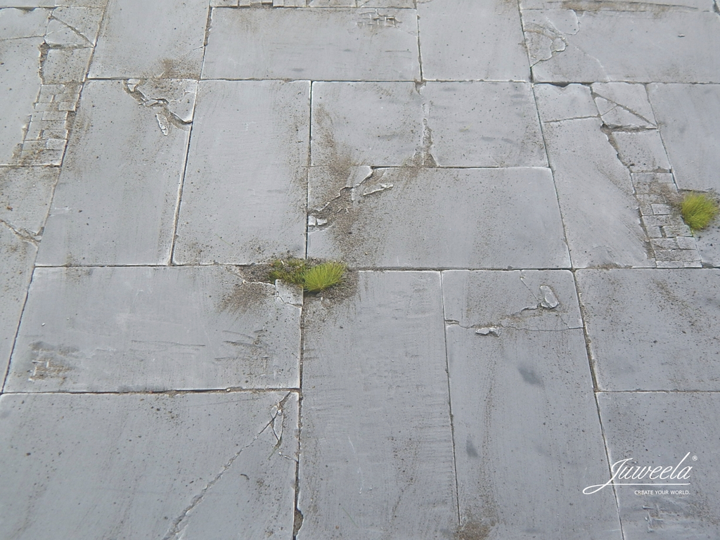 Platten aus Beton wie sie in jedes Diorama prima passen. Diese hier kommen ordentlich benutzt daher: Risse, Ab-/Brüche, Abschürfungen, Abnutzungen, Ausbesserungen, Löcher in denen das Gras wächst.