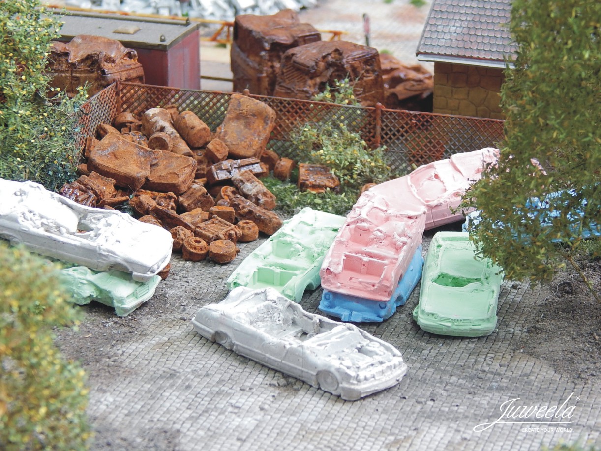 Auch ein Autoleben hat mal ein Ende. Diese hier stehen schon etwas länger auf dem Schrottplatz Ihres Dioramas und warten auf den Transport mit Eisenbahn oder LKW.