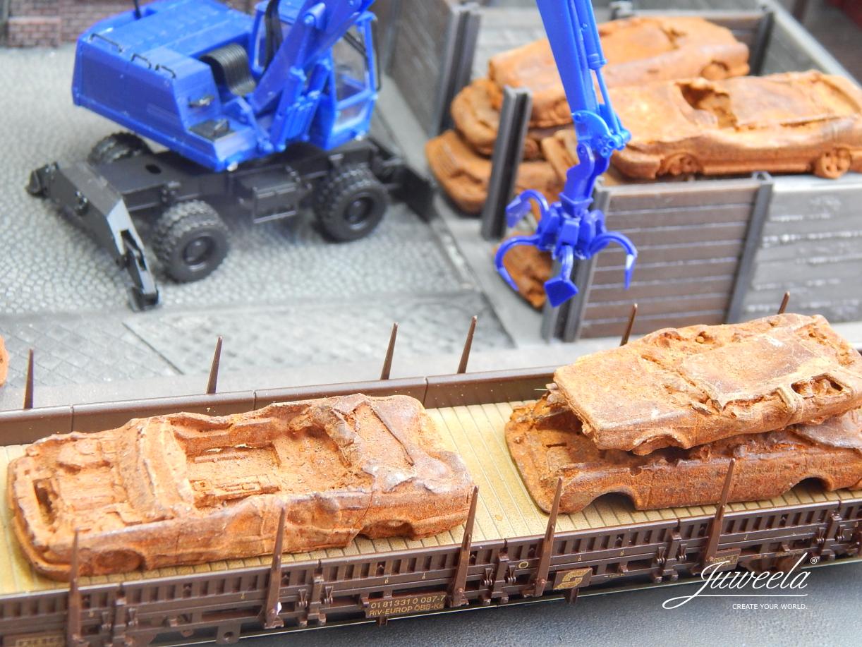 Auch ein Autoleben hat mal ein Ende. Diese hier stehen schon etwas länger auf dem Schrottplatz Ihres Dioramas und warten auf den Transport mit Eisenbahn oder LKW.
