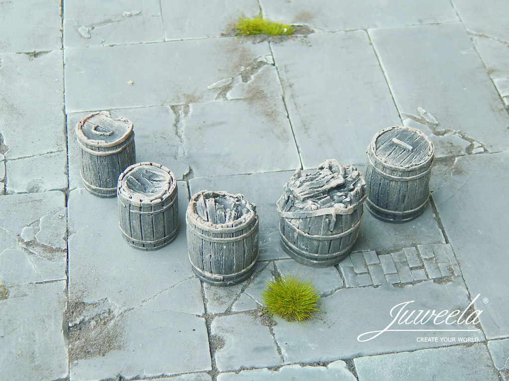 Alte Holzfässer für den Transport, als Barriere, zum Stapeln, als Detail, als Ladegut, zum Umfallen-Lassen oder einfach nur für den Weintransport eurer Minis. Diese Fässer hier sind alt, abgenutzt, beschädigt, gesplittert.