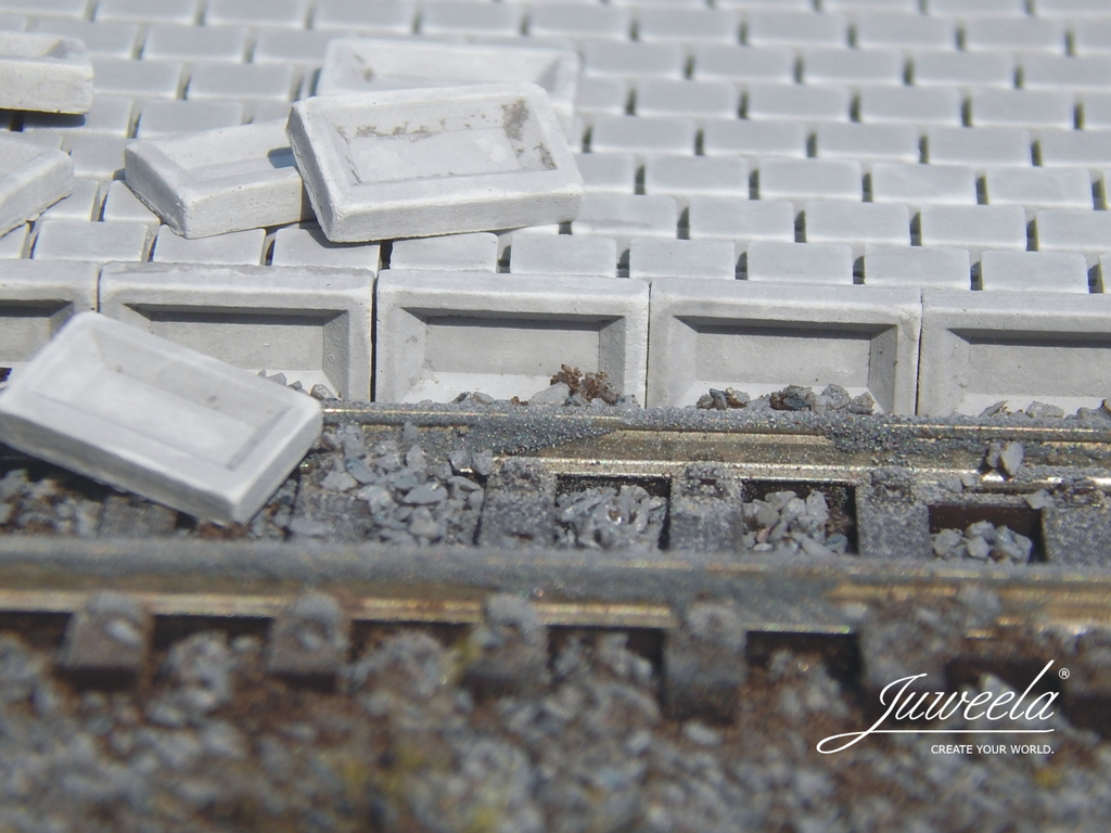 Zur Gestaltung oder zum Anlegen von Bahnsteigen für die Modelleisenbahn Spur H0. Die Bahnsteigkanten werden als Verblender eingesetzt. So läßt sich schnell und einfach ein optisch reizvoller Bahnsteig-Bereich und Hingucker im Diorama darstellen.