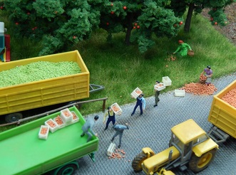 Hmm, Baumobst ist lecker - und vieles davon kommen auf einen Wagen: z.B. auf den Erntewagen, denn z.B. Äpfel wurden auch mit der Eisenbahn transportiert. Natürlich kullern sie auch gerne über das Diorama.