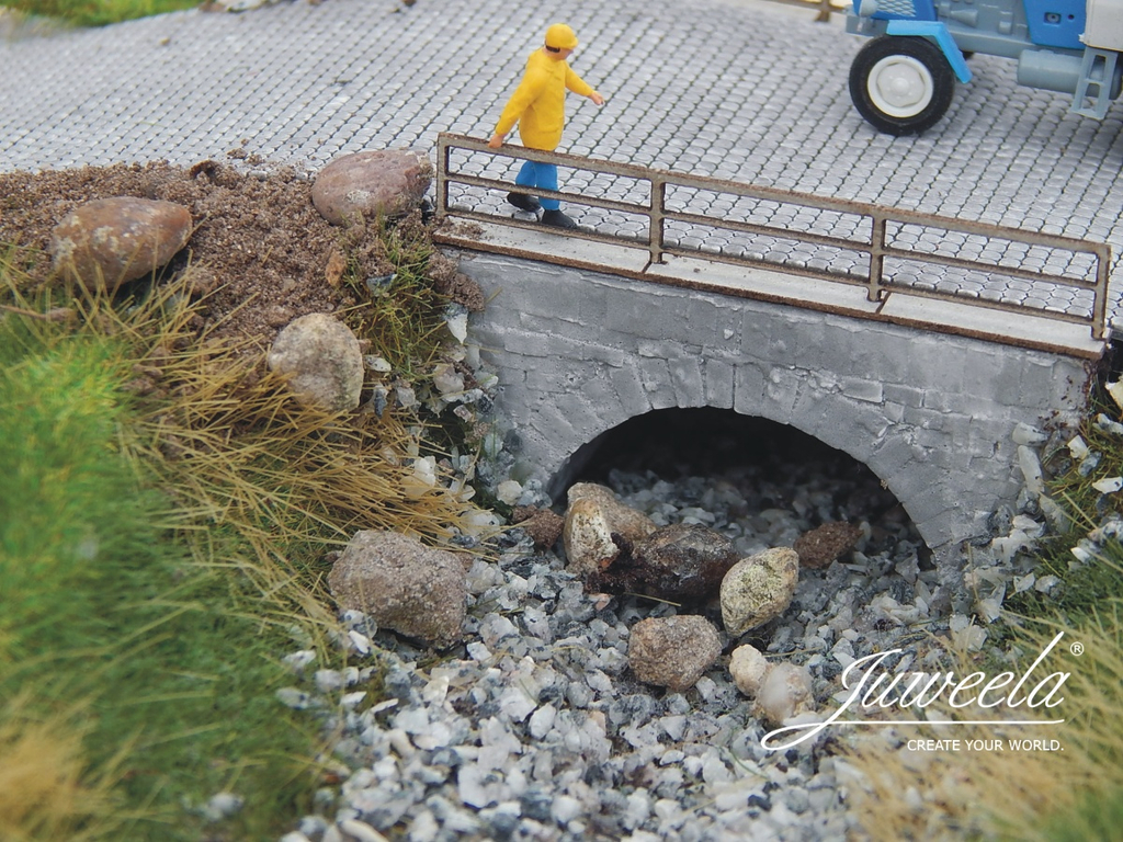 Die Ziegelstein-Struktur fügt sich in jedem Diorama gut ein. Da die Unterseite ebenfalls mit Ziegeln gemauert ist, sind viele schöne Details in der Modellbau Landschaft darstellbar.