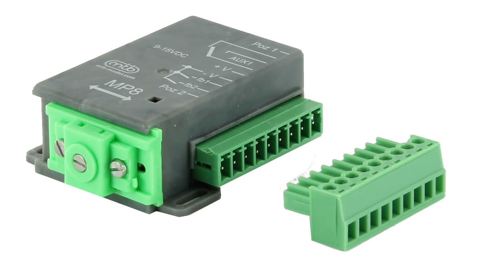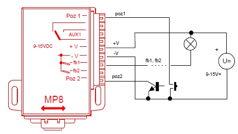 Der MP8-Weichenantrieb dient als Ersatz für den Standard-Zweispulen-Schalter, mit kurzer Impulssteuerung. Die Versorgungsspannung beträgt 9-14V DC, die permanent angelegt werden muss (+V und -V). Die Übergabe an die Endlage erfolgt über ein Speicherrelais, das durch einen kurzen Impuls (min 40ms) vom Steuergerät/Schalter betätigt wird. Die Impulseingänge sind zwei POS1,POS2, durch Schalten des Eingangs auf Spannung -V (gemeinsamer Nullpunkt) wird die Bewegung gestartet. Die Elektronik des Schiebers sorgt für eine sanfte Umschaltung und Fahrt in die Endlage, auch wenn der Steuerimpuls bereits verstrichen ist. Die Ausgänge (fb1, fb2) sind zur Signalisierung der Endlage des Schalters mittels einer LED oder einer Glühlampe vorgesehen, diese Kontakte schalten nach Erreichen des Minuspols der Spannung (-V). Eventuell können die Ausgänge für die Elektronik als Rückmeldung der Geräteposition verwendet werden.